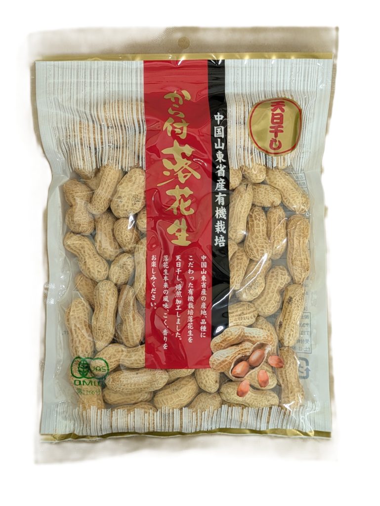 有機栽培で育てられた中国山東省産のから付落花生です。自然の恵みで育てた落花生を天日干し、焙煎加工しました。香ばしい風味とやさしい甘みが特徴。殻をむいてそのままお召し上がりいただけ、落花生本来の風味、こく、香りをお楽しみください!!