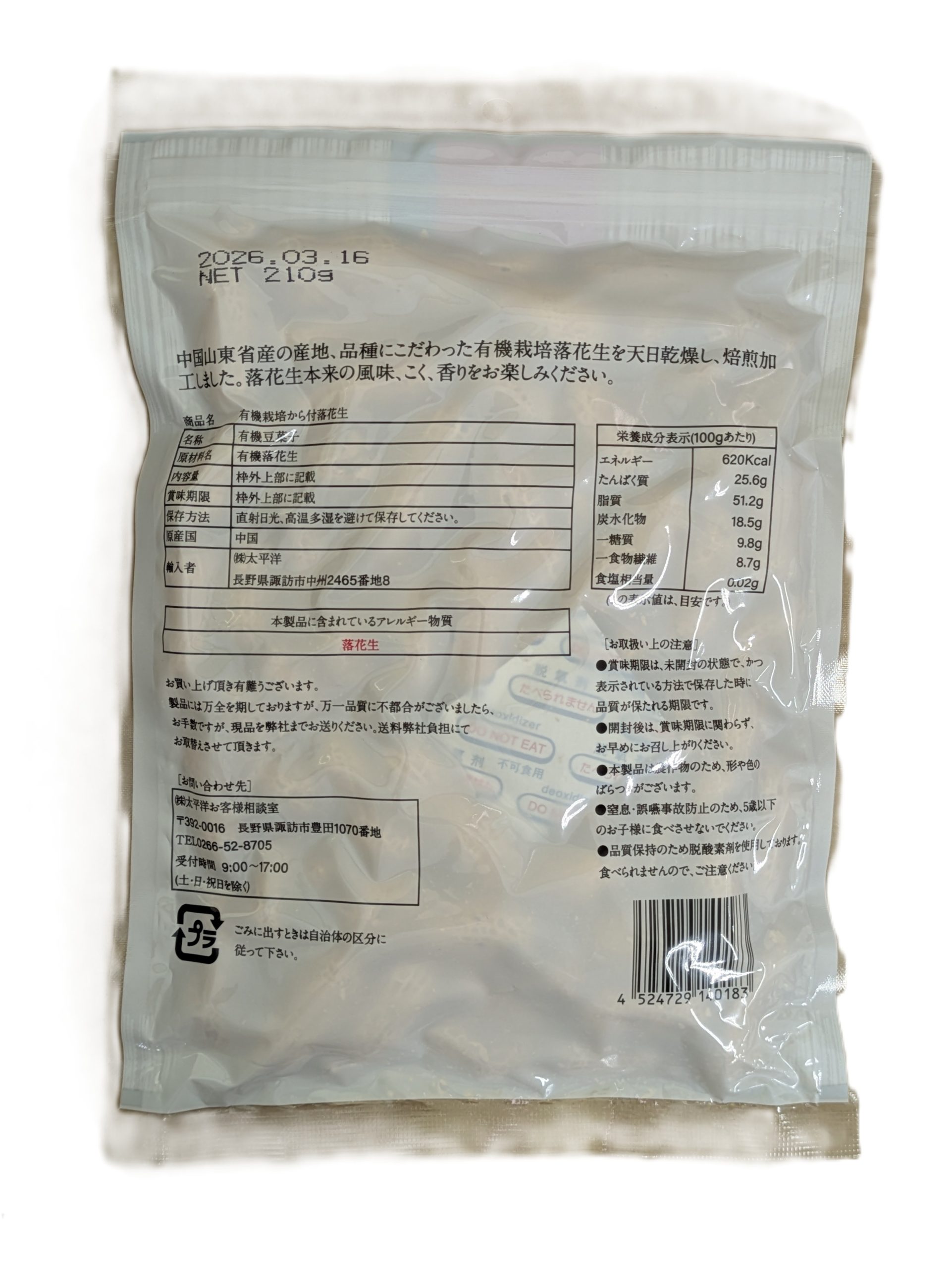 中国山東省産の産地、品種にこだわった有機栽培落花生を天日干し、焙煎加工しました。落花生本来の風味、こく、香りをお楽しみください。